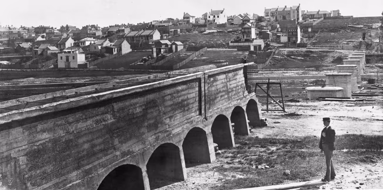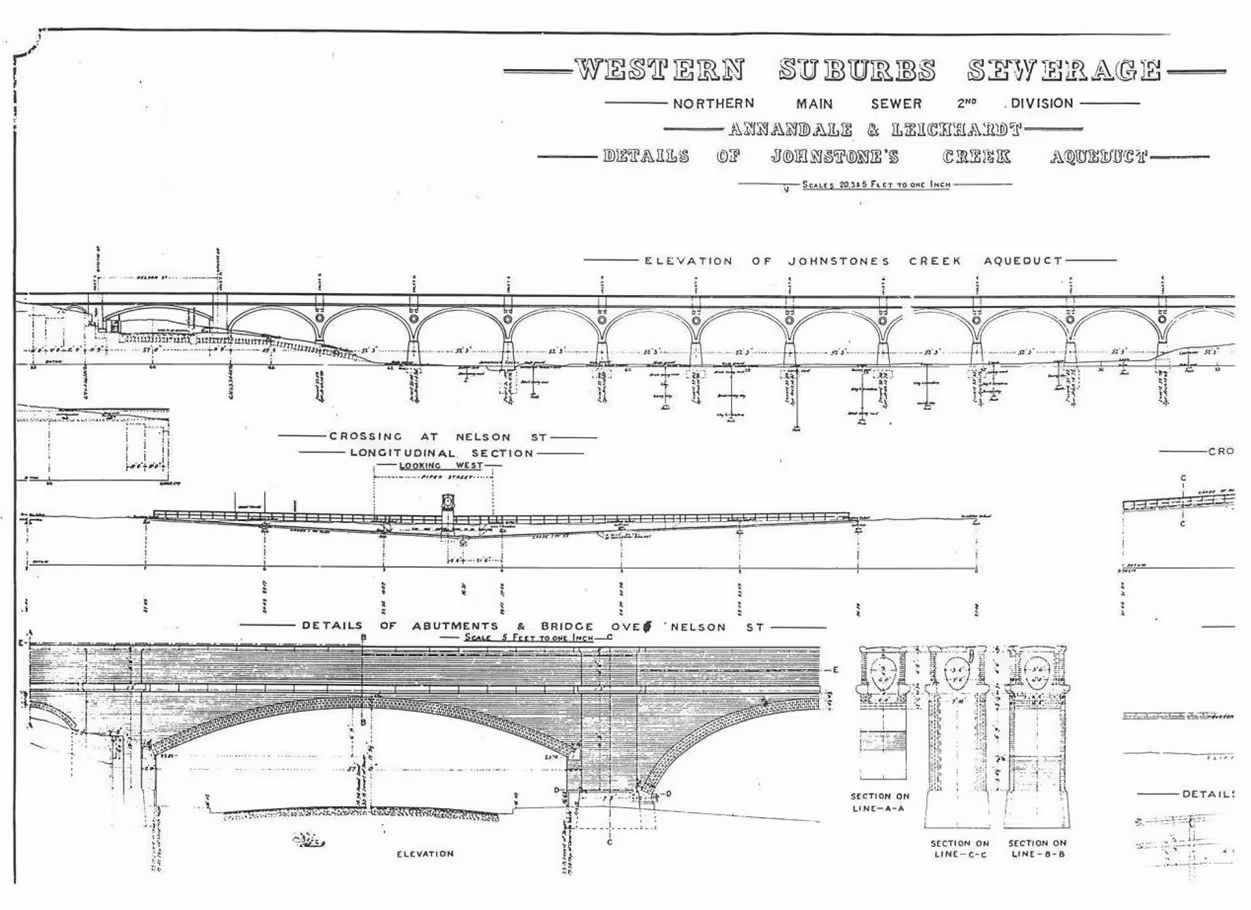 The separation of the Sydney’s combined stormwater and sewer pipework began in 1887, and by 1889 the Sydney sewer network had reached 140km of pipe and was servicing close to 25,000 properties across the inner city. With this flow discharging into the harbour, construction of more sustainable options had been underway for some time. Construction of the Bondi Ocean Outfall andBotany Sewage Farmwas completed in 1889 and allowed for further expansion of Sydney’s sewer network.This included the Northern Main Sewer which would service the growing population in Annandale and Balmain and transport flow to a main line junction at the corner of Parramatta Rd and City Rd, then all the way through to Bondi. This extension required crossing both Johnstone’s Creek and White’s Creek with the construction of aqueducts the most suitable design option of the time.